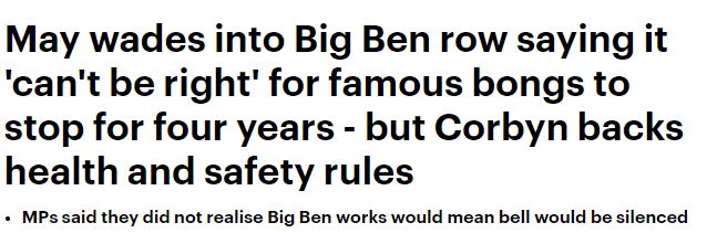 面对首相的意见,首相的对头,工党领袖科尔宾进行了反击,重申了对员工们健康和安全的考虑,然而更多蒙圈的议员表示根本没想到修缮大本钟意味着要将鸣钟停掉。