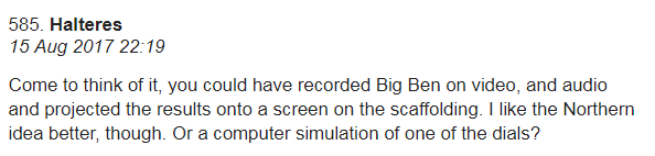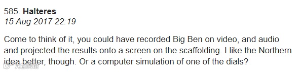 Halteres:其实想想,你可以把大本钟的视频和音频录下来,然后把它们投影到维修脚手架上,或者用电脑合成大本钟的表盘?