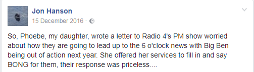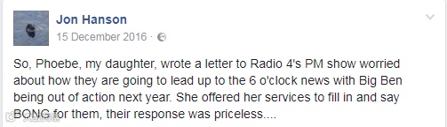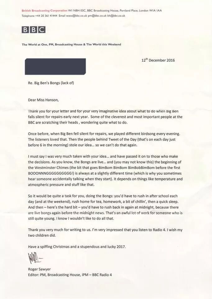 我的女儿菲比写了封信给Radio 4的PM节目,对大本钟明年休息后,他们要如何跟进6点档新闻表示了担心,她提议自己来顶替这个位置然后为他们模仿钟声BONG,他们的回复也非常珍贵……