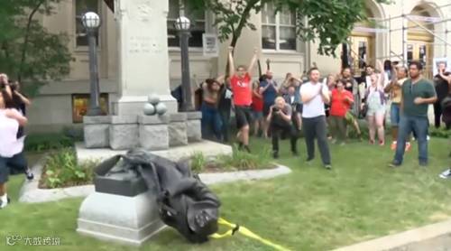 无独有偶,据媒体报道,15日美国北卡罗来纳州(North Carolina State)也爆发示威,示威者移除一尊罗伯特·李的雕像。示威者攀上梯子,将雕像推倒,人群随即爆发一片欢呼声……