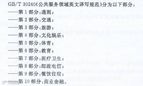 《标准》规定了交通、旅游、文化、娱乐、体育、教育、医疗卫生、邮政、电信、餐饮、住宿、商业、金融共13个服务领域英文译写的原则、方法和要求。