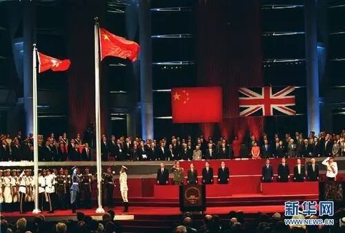 1997年7月1日零时,在雄壮激昂的国歌声中,鲜艳的五星红旗与紫荆花区旗,相伴冉冉升起。