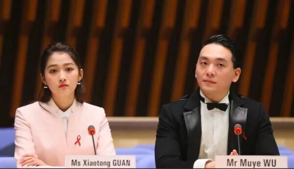 在活动现场,关晓彤作为唯一的青年女性代表,穿着浅粉色西服套装,胸前别着艾滋病的红丝带标志,做了全英文演讲。