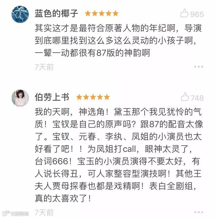 扮演宝黛钗三人的小演员分别为11、10、12岁,有考据党称他们的年龄与原著正好吻合,小演员们在年龄上“弥补了87版的唯一遗憾”。