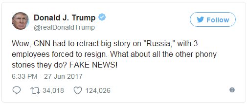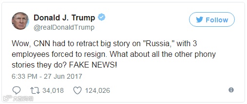 哇,CNN不得不撤回了“俄罗斯”的大新闻,三名雇员被迫辞职。那他们其他编出来的新闻要不要撤?假新闻!