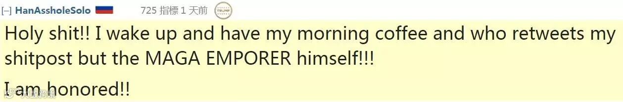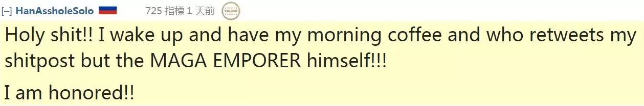 我的天哪!一觉醒来,正喝咖啡呢,这谁呀转我的帖子,竟然是让美国再次伟大的川普大帝本人!!!荣幸之至!!
