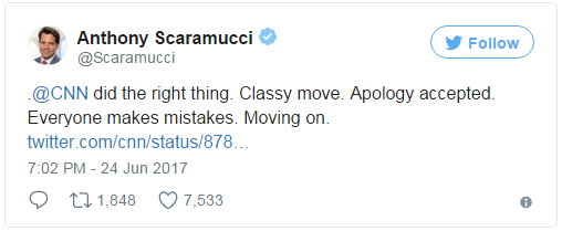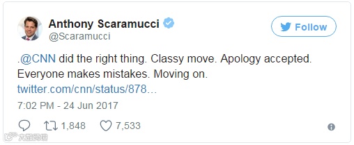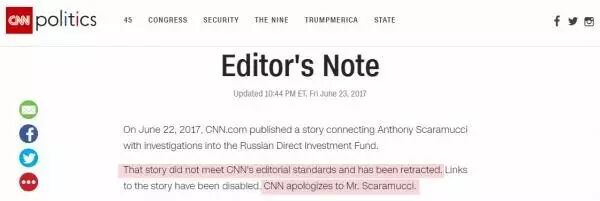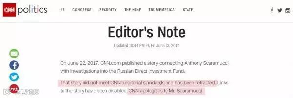CNN很快地发布了编者的话(Editor's note),解释删文原因,还就涉事新闻向安东尼·斯卡拉穆奇道歉。