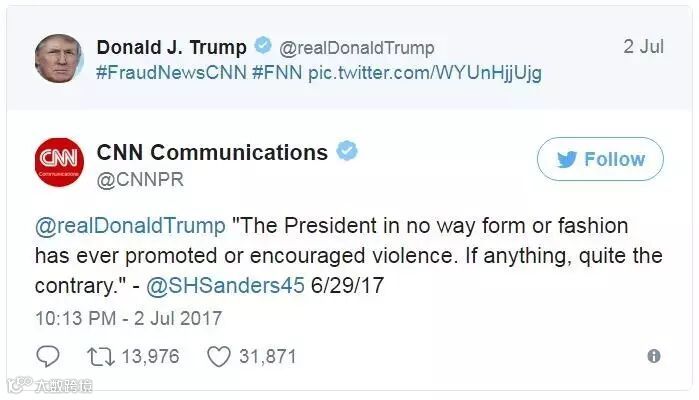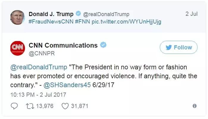 CNN没好气地转发了特朗普的推特,直接引用了白宫副新闻发言人莎拉·桑德斯(Sarah Sanders)不久前说的一句话,啪啪打脸白宫。