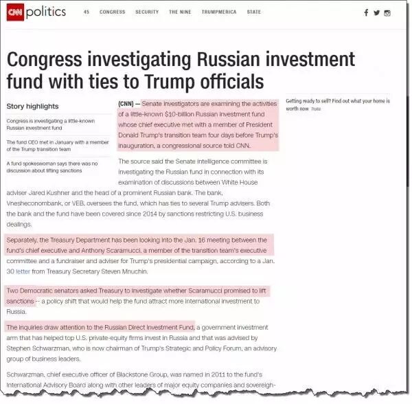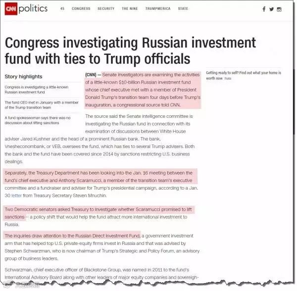 6月22日下午,CNN发了篇报道,写稿的不是别人,正是普利策奖获奖记者托马斯·弗兰克,文章称“国会正在调查俄罗斯投资基金和特朗普官员的关系。”