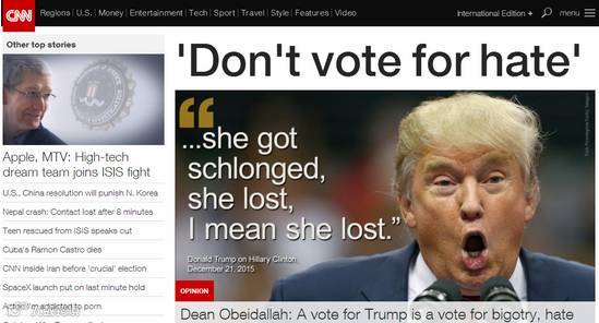 党内初选期间,CNN就曾在网站首页呼吁选民不要把票投给他。