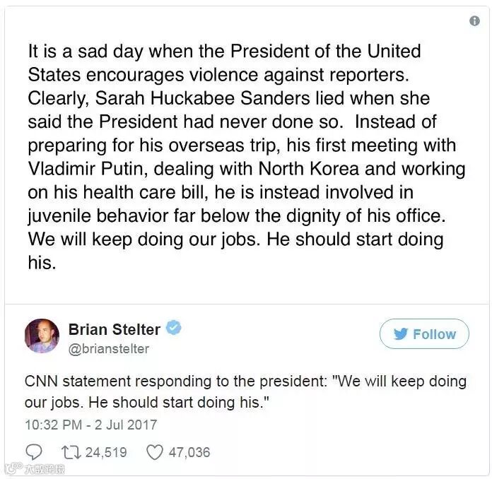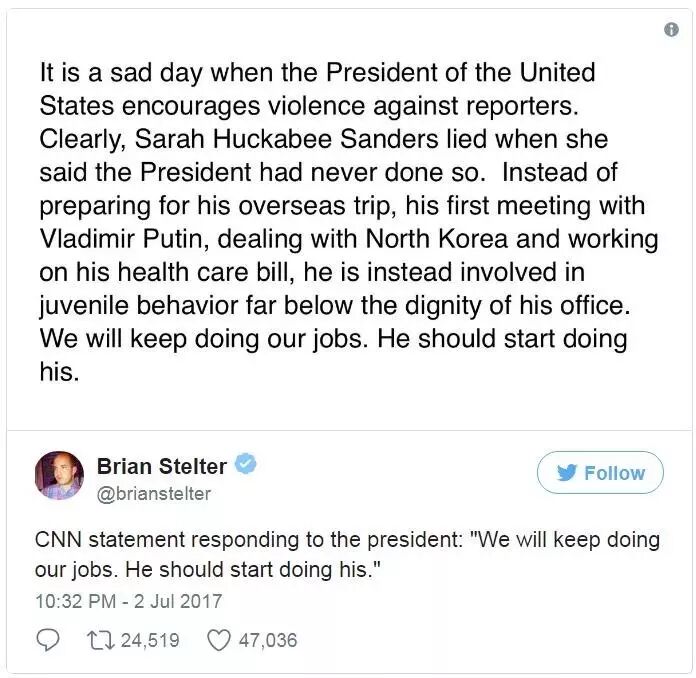 CNN还专门发表了一个声明,回应这一事件,CNN称特朗普的做法是“幼稚行为,太有失自己作为总统的尊严”(juvenile behavior far below the dignity of his office)。