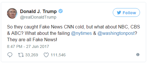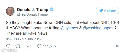 随后,特朗普又发推“补刀”,其他几家“假新闻”媒体也纷纷躺枪。