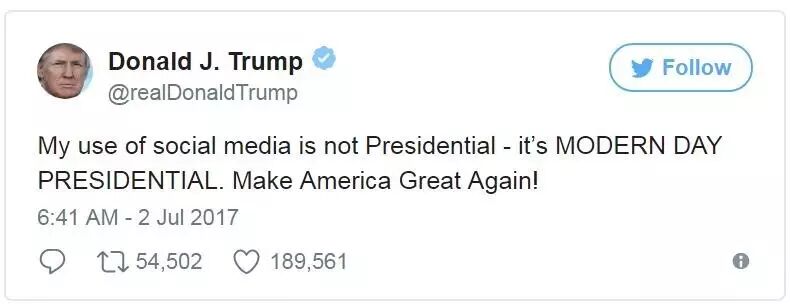 我玩社交媒体不是总统行为,是新时代的总统行为!让美国再次伟大!
