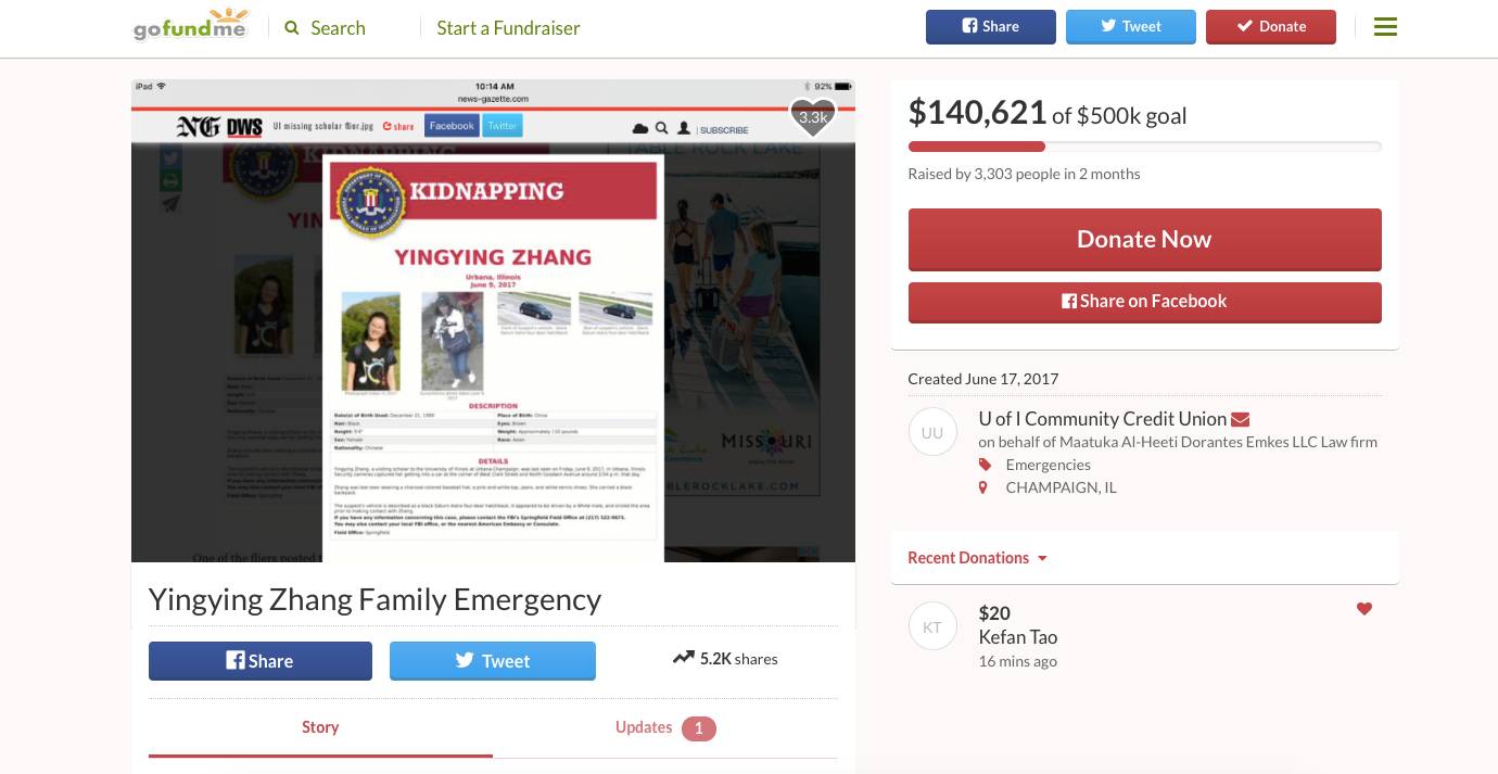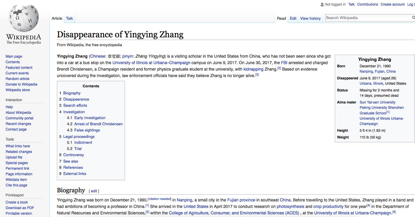 Zhang Yingying, female, aged 26, was a Chinese visiting student at University of Illinois Urbana Champagne (UIUC). At noon local time on June 9, 2017, Zhang Yingying was on her way to sign an apartment lease, but she was not to be seen by anybody ever since.