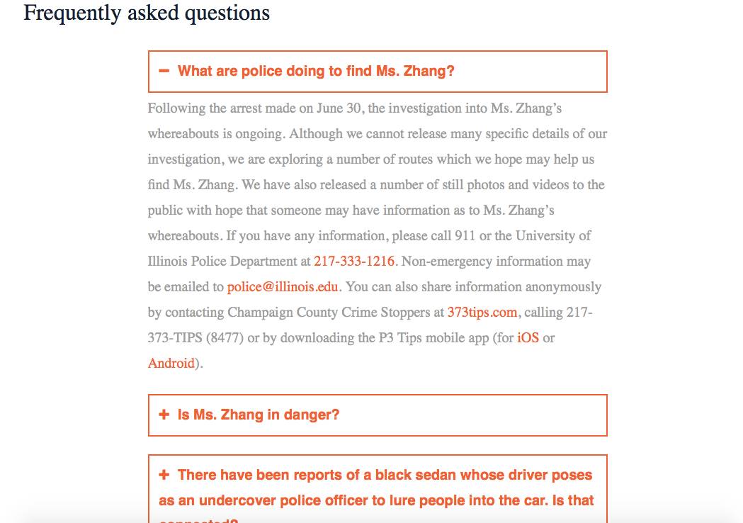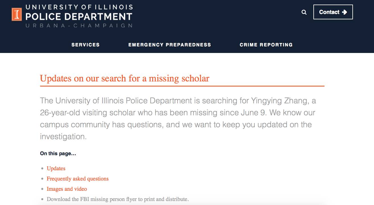“章莹颖,女,26岁,伊利诺伊大学厄巴纳-香槟分校(UIUC)访问学生。于当地时间2017年6月9日中午失联。”
