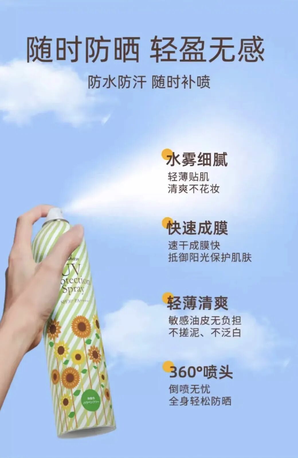 自从开始重视防晒,用了这种方便的防晒喷雾,才打开新世界大门。像它这种大容量、360°喷头的设计,全身都能照顾到,随时补喷超省心✌️ 现在就算大太阳出门,也不担心被晒黑晒伤,皮肤状态都稳定好多!”