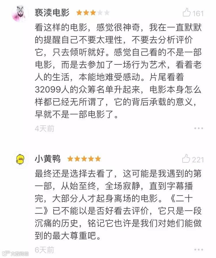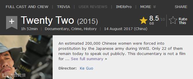 《二十二》是中国“慰安妇”题材纪录片第一次在院线展映,片子是3万多人众筹拍的,前期也没有做更多的宣传。