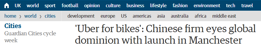 《卫报》(The Guardian)对摩拜进行了多篇报道,可以说是非常宠爱了……