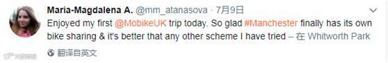 今天很享受我的第一次摩拜单车之旅。特别开心曼彻斯特有了自己的共享单车,而且比我在其他地方试过的共享单车都更好!