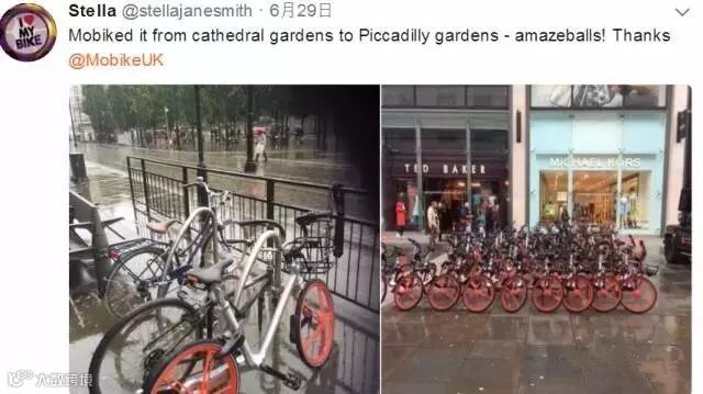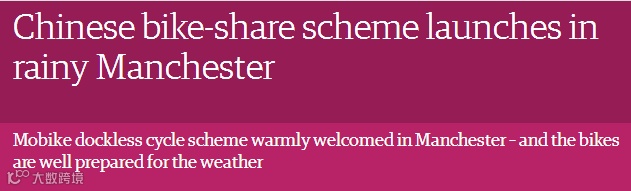 《卫报》俏皮地说“尽管这是个阴郁的6月,摩拜单车还是受到了热烈的欢迎”(The bikes received a warm welcome despite the June gloom)。