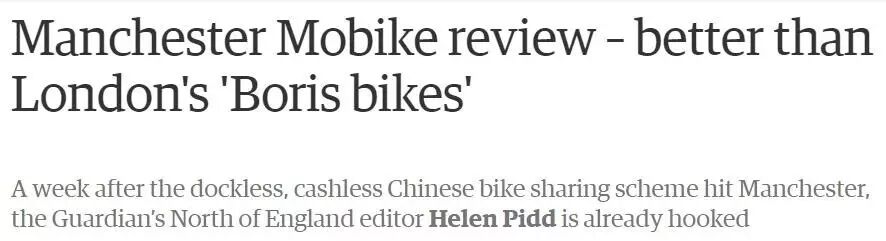 《卫报》的小编在曼城体验过摩拜单车后,还激动地写了一篇洋洋洒洒的长评,直言比伦敦的共享单车“鲍里斯单车”好太多!