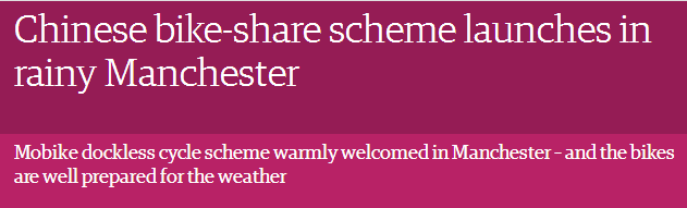 最近,中国的共享单车品牌摩拜又“抢占”了曼彻斯特的街道。