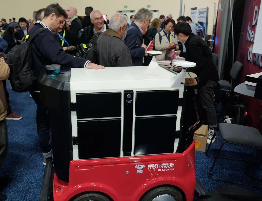 在当地时间1月6日的预展现场京东的配送机器人和配送机器人智能配送站受到了全面关注。上面的是京东的配送机器人,目前已经从封闭的园区配送逐步实现市区开放环境配送,并在北京、西安、雄安新区、长沙、呼和浩特等地实现落地。