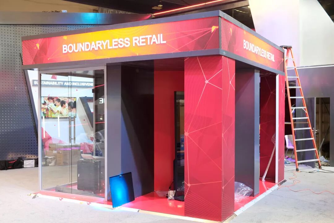 这是还在搭建中的无界零售亭,在这次无界零售的展区里我们能够看到很多线上与线下相融合的解决方案,包括利用AR等技术改变人们试妆、试衣等体验的产品,以及服务于线下门店进行数字化运营的门店科技产品。