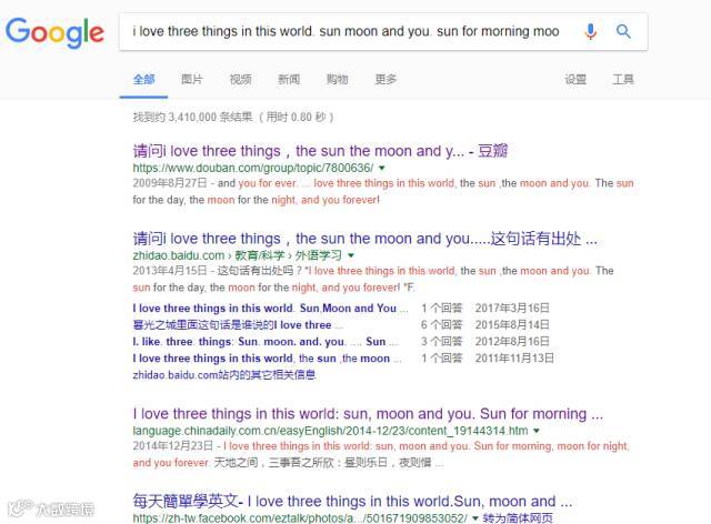 搜索结果显示,这段英文的来源大都是国内的网站,比如百度知道、豆瓣、一些培训机构网站等,但在英文网站上找不到权威的引用,这说明它的真实性很可疑。