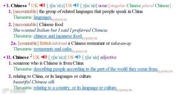 再结合词典的解释,我们可以发现,当Chinese作为名词时,它的含义是“汉语;中国菜”,因此不能用“I am a Chinese”来表示“我是中国人”,只能说“I am Chinese / I am a Chinese person”.