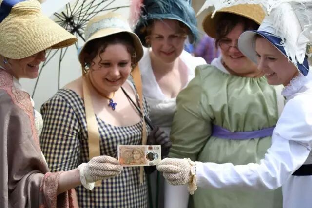 简迷们穿着摄政时期的服饰,手持印有简·奥斯汀头像的钞票进行纪念