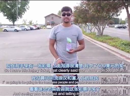 这次,Johal假扮成一位盲人,拿着一张500美元的中奖彩票分别去了穷人区和富人区,让那里的路人“帮忙确认”中奖数额。Johal想知道,在面对金钱的诱惑时,穷人和富人分别是怎样反应的。