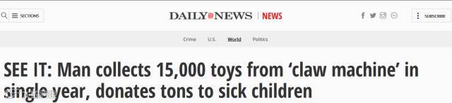 男子一年从“抓娃娃机”抓15000个娃娃,捐给了一堆给患病儿童