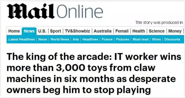 游乐场之王:IT工作者6个月抓娃娃3000只,老板求他别抓了