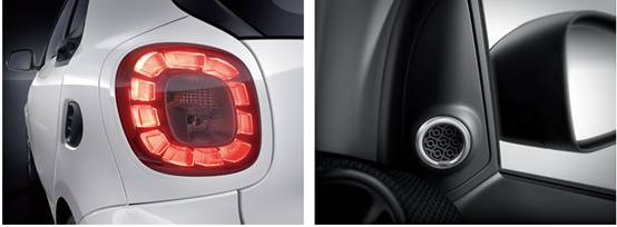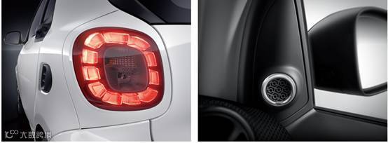 基于smart fortwo 52千瓦硬顶激情版打造的新声特别版提供星空蓝、熔岩橙、水晶白以及深邃灰四种别具风格的车身面板,搭配白色tridion安全车体结构与进气格栅(air intake grille)。smart新声特别版标配LED及传感器套件,包括独具特色的带U型LED日间行车灯的前大灯、前雾灯及LED尾灯。还有15英寸双五幅轻合金轮毂(light alloy wheel rim)则让smart新声特别版的动感魅力再度升级。