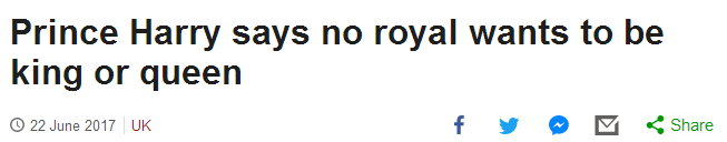 英国广播公司(BBC):哈里王子说没有皇室成员想当国王或女王。
