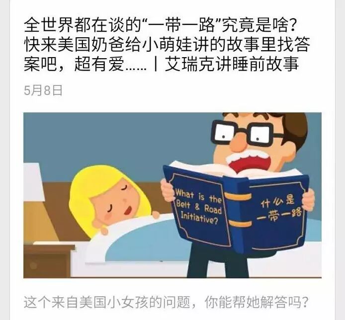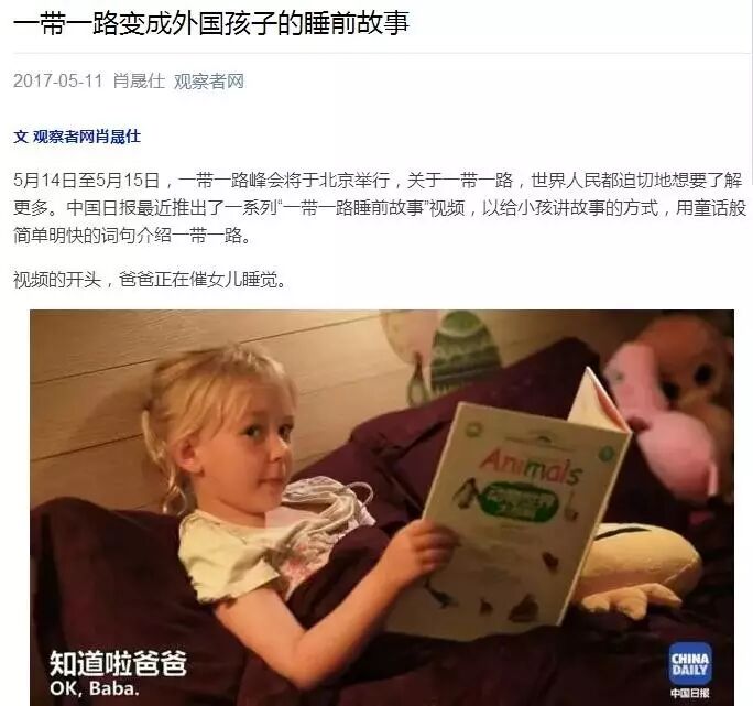 《中国日报》发布了一系列美国爸爸给女儿讲睡前故事的视频,故事讲述了“一带一路”的“理念来自中国,但为全世界共享”。