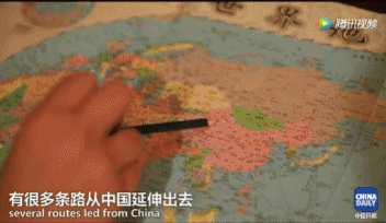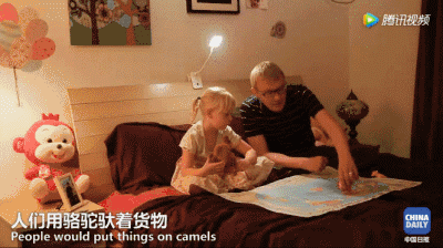 在目前发布的两段视频中,一个父亲通过让一头装有发条的骆驼在地图上移动的形式,介绍古丝绸之路上的亚洲贸易,以及中国如何计划帮助开发这些曾经经过的地区。