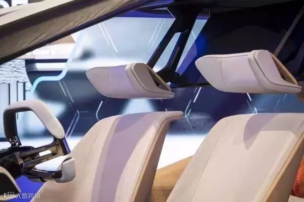 可以用“悬浮(floating)”来概括这个概念座舱最骚气的特点。超大的宽屏幕竟然是悬在空中的,细看才发现是和前排头枕(front head rests)一起用一个框架固定在车顶,而且还是抬头显示的!低头工作半天,到车里看电影治颈椎,有没有?!