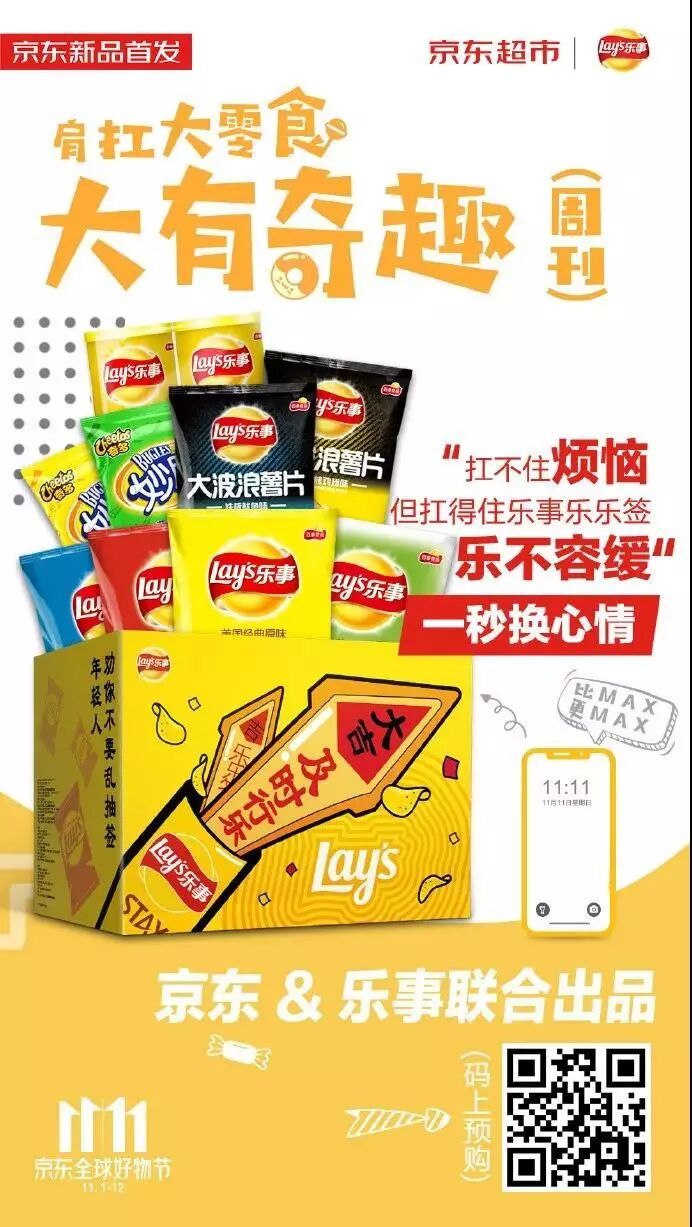 在京东11.11“肩扛大零食”系列中,有大箱签筒包装的乐事薯片,半个女朋友高的糖果装良品铺子,情话满满双手都抱不下的好时之吻魔法书等等,这些零食包不仅容量超大,还极具趣味性、分享性,区别针对常规产品的传统营销,京东和各品牌大挖脑洞,让产品本身自带社交基因和传播属性,为京东用户提供了喜爱零食全新有趣的打开方式,带去了大有奇趣的新潮体验。