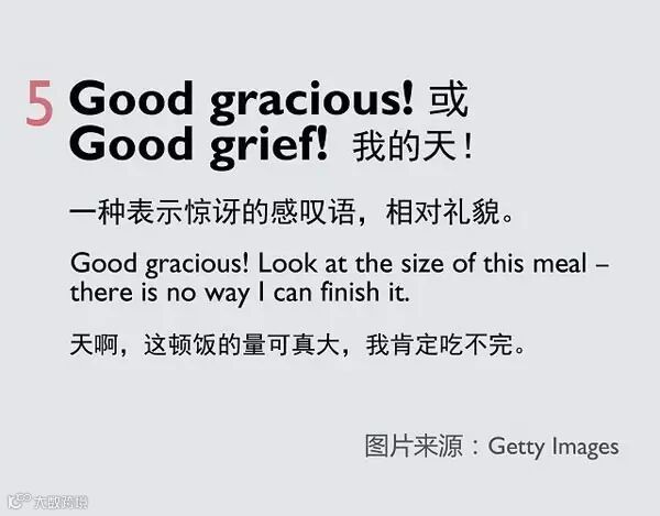 英语中,在表示惊讶时,很多人会使用“Oh, my God”。在口语会话中,其实还有其它可以替代这种说法的感叹方式。看图,学习用五种英语表达说“我的天啊”。