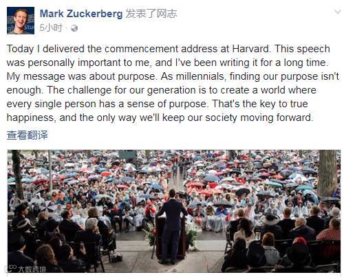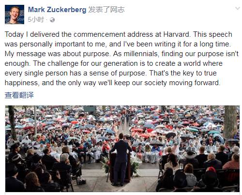 注:英文原文来自扎克伯格的Facebook主页,和现场发言稿有小出入