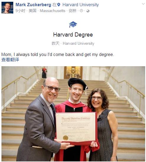 Facebook创始人马克·扎克伯格可以说是哈佛最成功的辍学生之一,美国当地时间5月25日,这位“辍学生”终于拿到学位,毕业了!