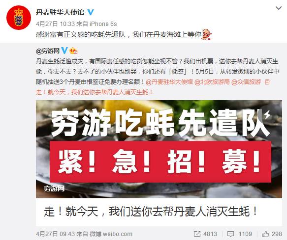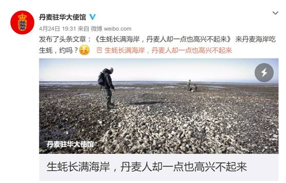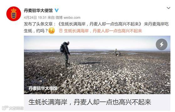 24号晚丹麦大使馆通过其新浪微博发布了一篇文章,讲了丹麦受到外来生蚝入侵引发的问题。中国网友热情回应,对如何解决这一问题展开讨论,这股热情随后席卷微信。