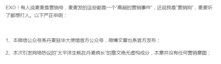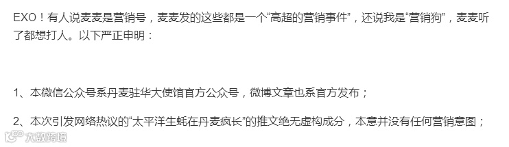 并在文中解释说,自己并非营销号,有关丹麦生蚝的推文本意并没有任何营销意图。