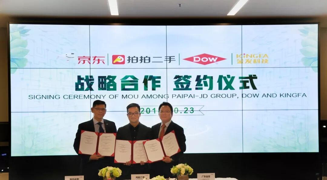 10月23日,京东拍拍二手与全球顶尖化工企业陶氏化学和中国产量最大、产品系列最全的改性塑料企业广东金发三方签署战略协议,三方将携手在“搭建再生供应链&品牌合作平台,推动再生产品个性化定制,构建循环经济产业链”等领域开展战略合作,力争2019年在夯实产业链的基础上,扩大品牌合作数量,打造环保再生系列产品,打开再生产品销售市场,成为可持续发展方式的引领者。