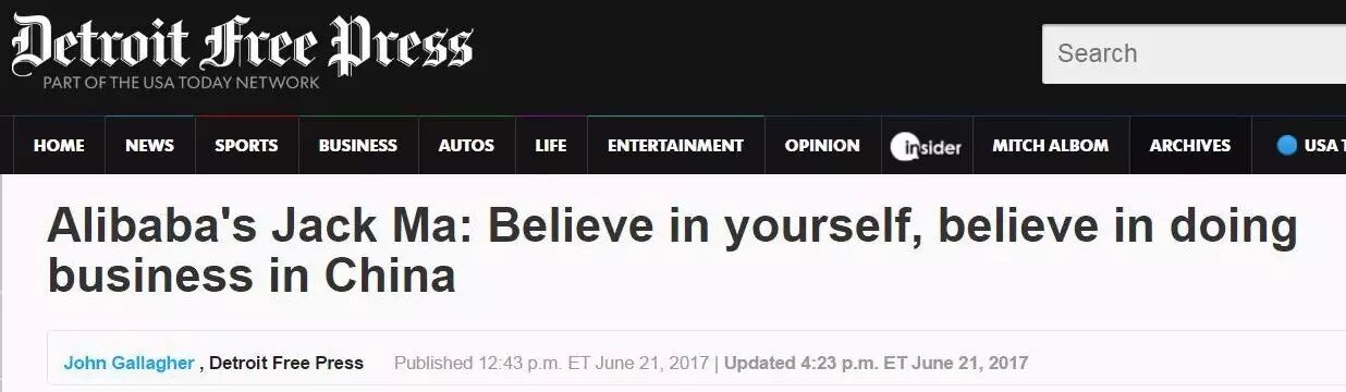 《底特律自由新闻报》(Detroit Free Press)写了一篇热情洋溢的报道,传递了马云的信息:号召美国企业去中国做生意。