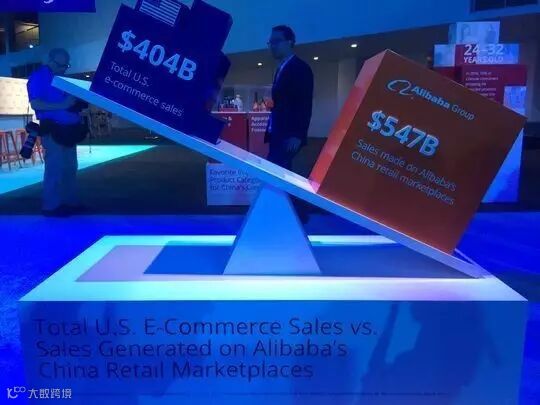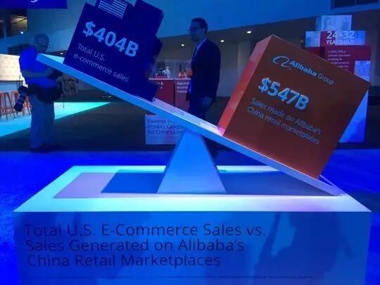 现场让很多美国CEO们惊叹的模型:整个美国的电商销售量和阿里巴巴一个平台在中国零售市场的销售量的对比。