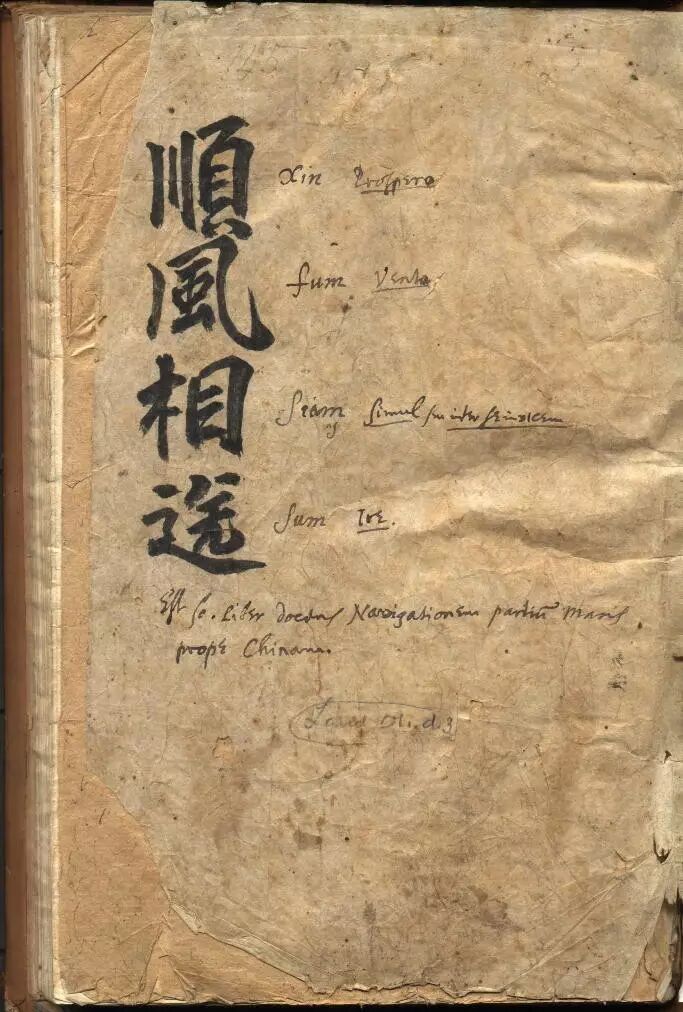 翻开牛津藏《顺风相送》,封面上赫然用手写标注着“顺风相送”四字的中文发音xin fum siam sum,这是生于1657年的南京人沈福宗于1685年到牛津,帮助博德利图书馆整理中文书籍收藏时写下的。下面还有当时牛津的图书管理员汤姆斯·海德(Thomas Hyde)拉丁文手写标注的"一部关于在中国附近海域的航海书"(A book about navigation on the seas near China)。