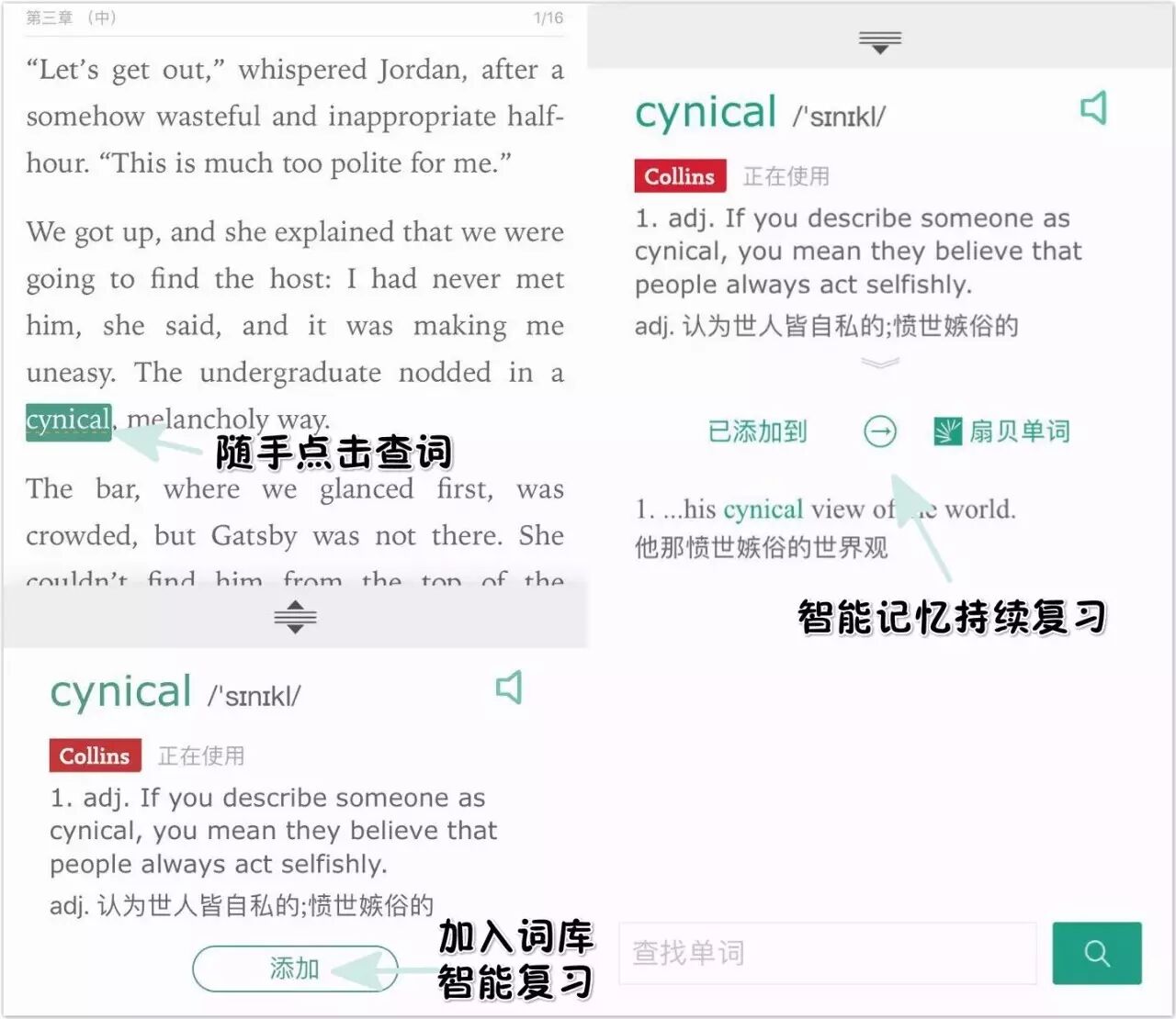 最大的优点就是:随手查词!收藏了之后就会给你复习,读读书顺便就背单词了